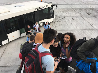 things up in a lobby, soon to board with everyone on a shuttle back to the
